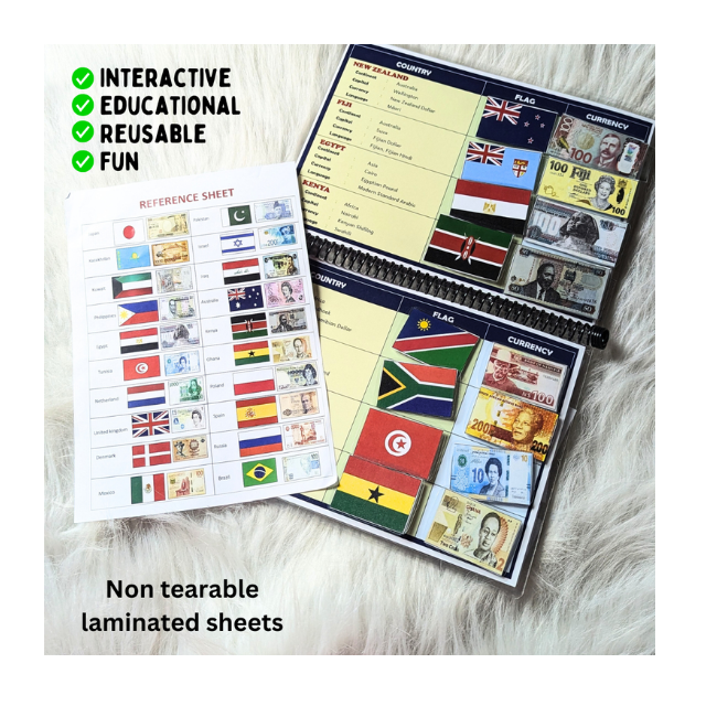 - Interactive Learning:Â 40 vibrant flag cut-outs and 40 currency cut-outs with 13mm Velcro attachments make learning fun and engaging.