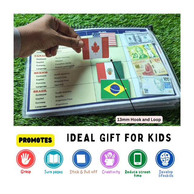 - Fine Motor Skills:Â Handling flag and currency cut-outs with Velcro attachments enhances fine motor skills and hand-eye coordination.